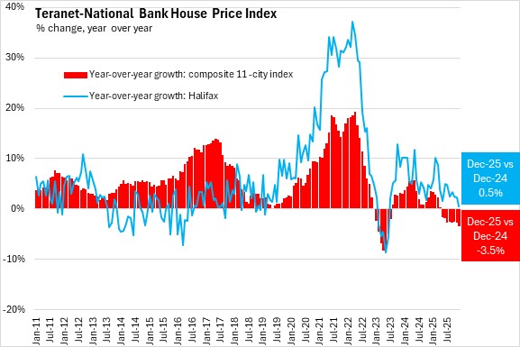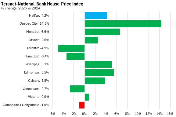 Halifax home prices were up 4.2% comparing the average values of 2025 with the average for 2024. The 11-city index in resale home prices was down 1.0% in 2025. Every city in the index except Toronto, Hamilton and Vancouver reported gains in 2025 average home prices, with Québec City reporting the largest increase.