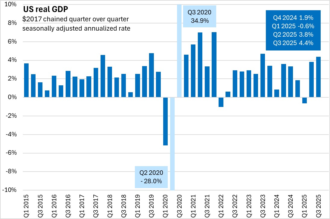 US real GDP growth was revised up 0.1 percentage point to 4.4% (seasonally adjusted annualized rate) in Q3 2025.
