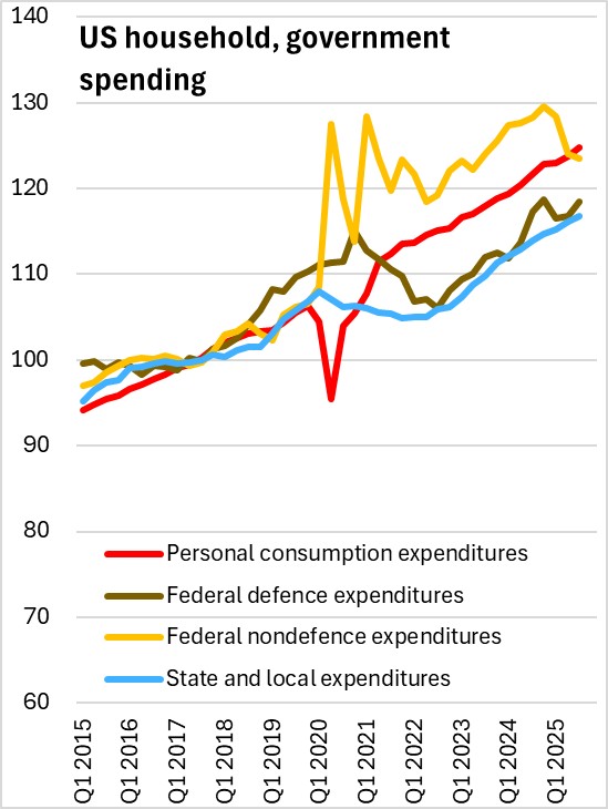 The increase in real GDP was driven by decreases in imports (-4.4%), which are subtracted from GDP, along with increases in exports (+9.6%), federal government defence spending (+5.7%), personal consumption expenditures (+3.5%), state and local government spending (+2.0%), and non-residential investment (+3.2%). These were partially offset by declines in Federal non-defence spending (-1.4%) and residential investment (-7.1%).
