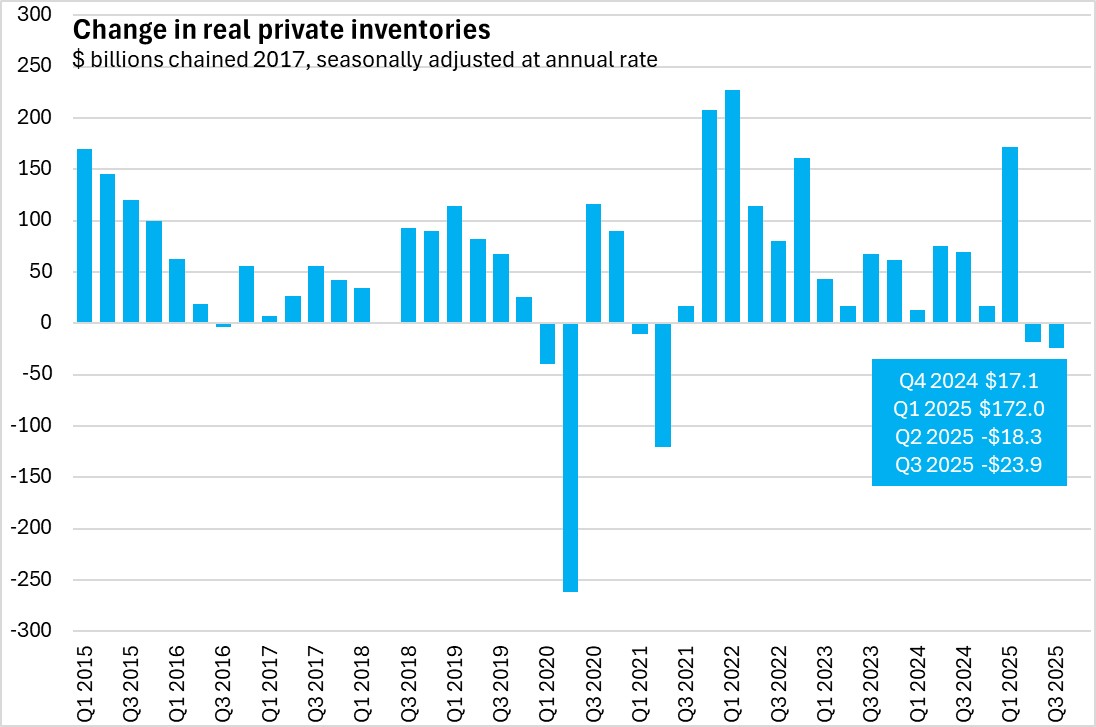 Private inventory investment was revised up to -$23.9 from -$29.6 billion net accumulation in the advanced estimates in Q3 2025.