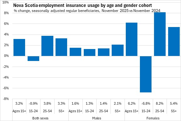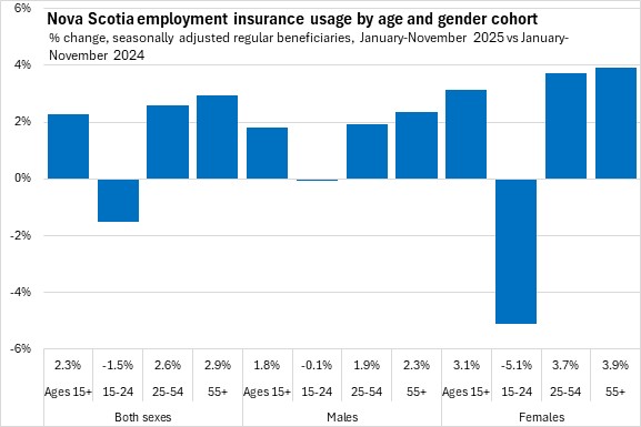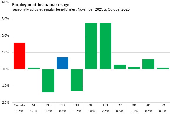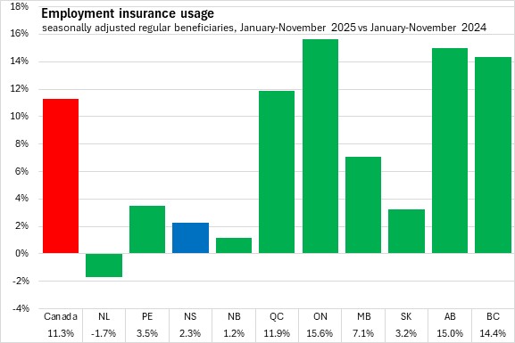 Compared to November 2024, Nova Scotia's employment insurance usage rose 3.2% (+710). National employment insurance usage increased 16.1% (+78,450) compared to November 2024. All provinces except Newfoundland and Labrador reported higher employment insurance compared to one year ago, with the fastest growth reported in Alberta and British Columbia.