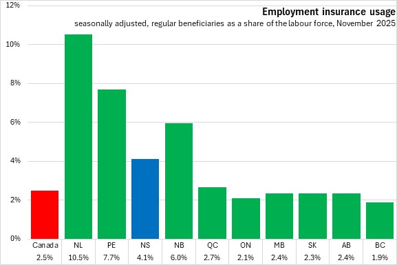 The number of employment insurance beneficiaries amounted to 4.1% of the labour force in Nova Scotia in November 2025. Nationally, the share of beneficiaries was 2.5% of the labour force. Newfoundland and Labrador had the largest share of beneficiaries of the labour force, while British Columbia had the lowest.