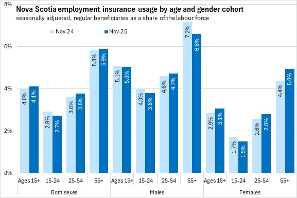 Use of employment insurance (as a share of the labour force) was lowest for youth (15-24) and highest for workers age 55 and over. Male use of employment insurance was higher as a share of the labour force than female use of employment insurance for all age cohorts in November 2025. Compared to one year ago, employment insurance usage as a share of the labour force was down for persons aged 15-24 and males age 55 and over, while it was up for core-aged and older females.