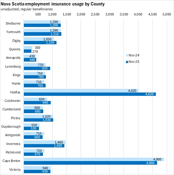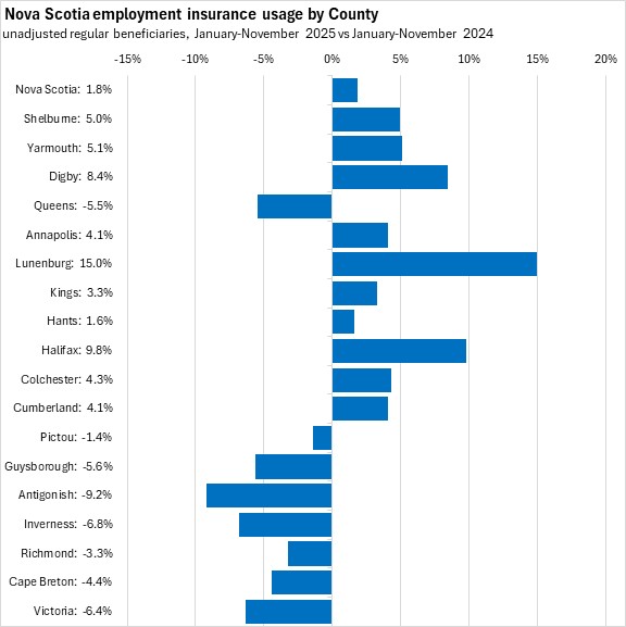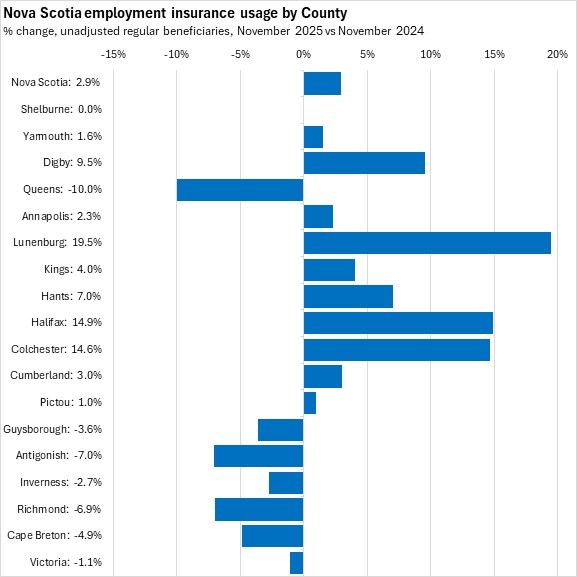 Comparing unadjusted regular beneficiaries for November 2025 against November 2024, the fastest growth in employment insurance usage (in percentage terms) was in Lunenburg county, followed by Halifax and Colchester. The fastest decline was in Queens county.
