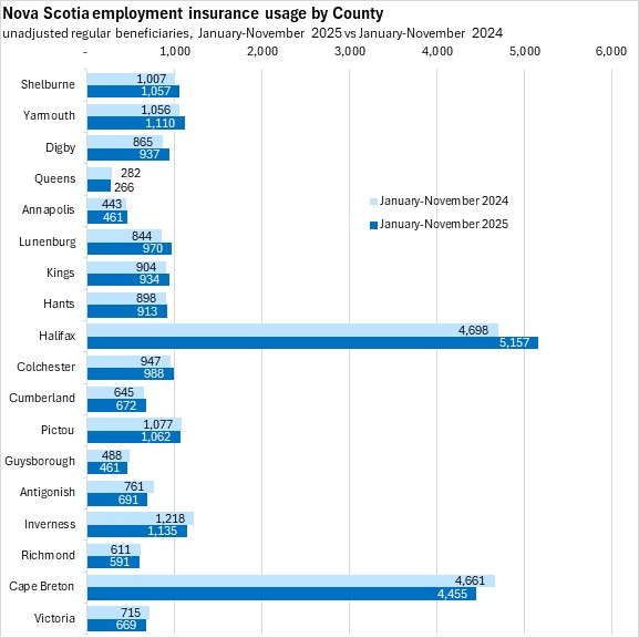 Comparing the first eleven months of 2025 with the same period in 2024, employment insurance usage declined in Queens, Pictou, Guysborough, and Antigonish counties along with all four counties on Cape Breton Island. Employment insurance usage increased the most (in percentage terms) in Lunenburg county, followed by Halifax and Digby counties.