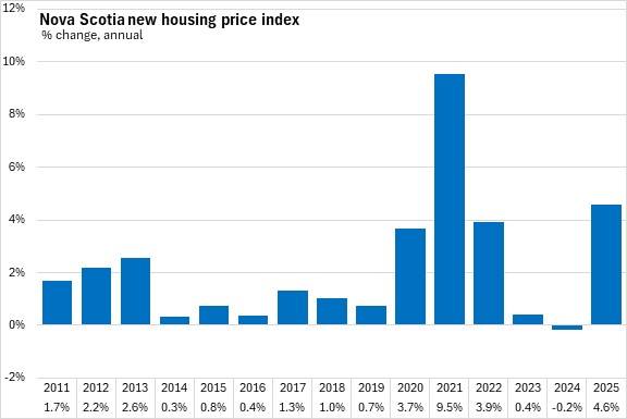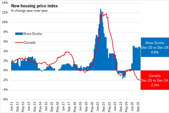Nova Scotia’s new housing prices increased 4.8% from December 2024 to December 2025. Nationally, prices were down 2.0%.