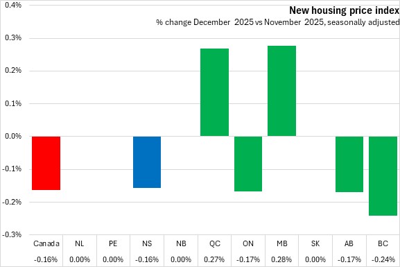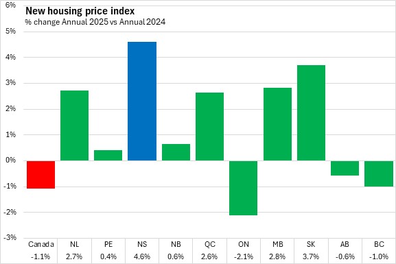 New housing prices in Nova Scotia declined 0.16% from November to December 2025. Nationally the price of new houses was also down 0.16%, with growth in Québec and Manitoba offset by declines in four other provinces. The fastest monthly decline was reported in British Columbia.
