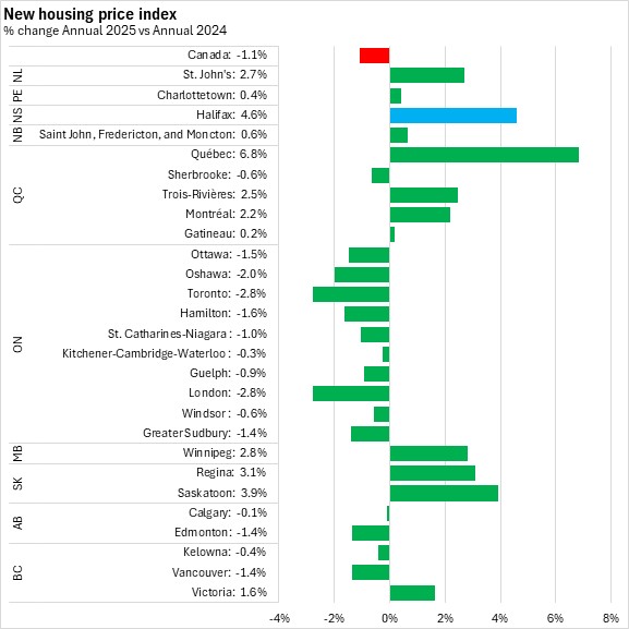 Halifax new housing prices were up 4.6% in 2025 compared to 2024, second fastest among provinces. The fastest growth among CMAs was in Québec City and the fastest declines were in London and Toronto.