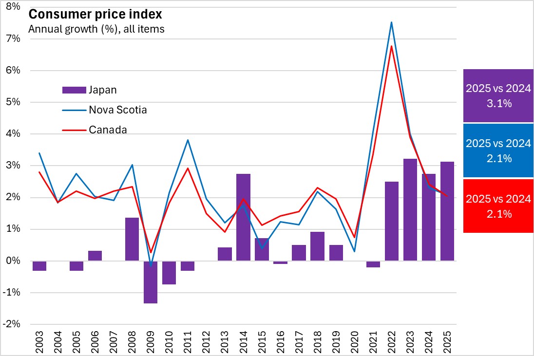 Japan's annual inflation was stronger than annual inflation in Canada or Nova Scotia for the last two years.