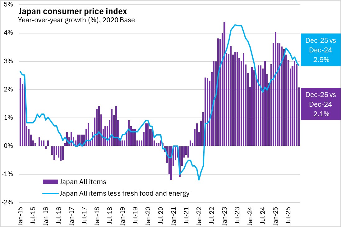 Japan’s inflation (all items, year-over-year growth in consumer price index) was 2.1% in December 2025, down from 2.9% in November. Japan's underlying inflation (all items excluding fresh food and energy) was 2.9%, down from 3.0% the previous month.