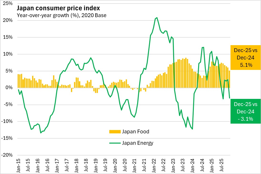 Japan's energy prices were down 3.1% in December 2025 compared with December 2024. Japan's food inflation was 5.1% over this period.