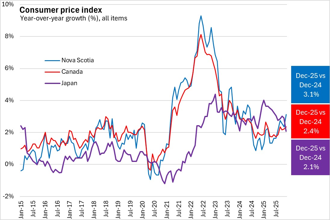 Japan's inflation was highest at the end of 2022 and the beginning of 2023, but was lower than inflation in Canada. With Canada's and Nova Scotia's inflation rates decelerating faster in 2024, inflation has been higher in Japan than in Nova Scotia up until December 2025 when inflation in Japan was below Nova Scotia and Canada.