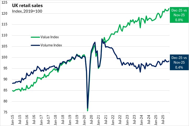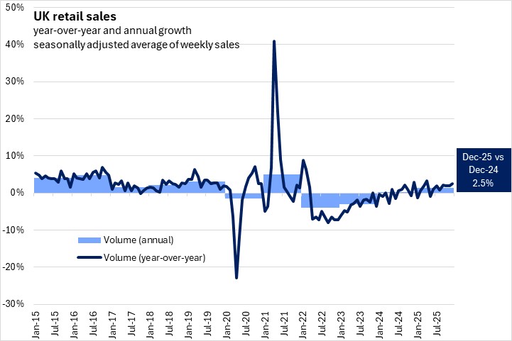 January 23, 2026UK RETAIL SALES, DECEMBER AND ANNUAL 2025 Month-over-month (December 2025 vs November 2025, seasonally adjusted)