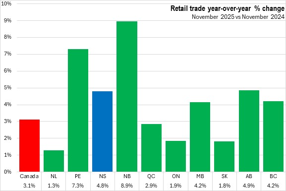 Nova Scotia retail trade increased 4.8% in November, compared to the same month last year. Nationally, retail trade was up 3.1% year-over-year. All provinces reported year-over-year increases in retail trade, led by New Brunswick. Newfoundland and Labrador reported the slowest year-over-year growth rate.