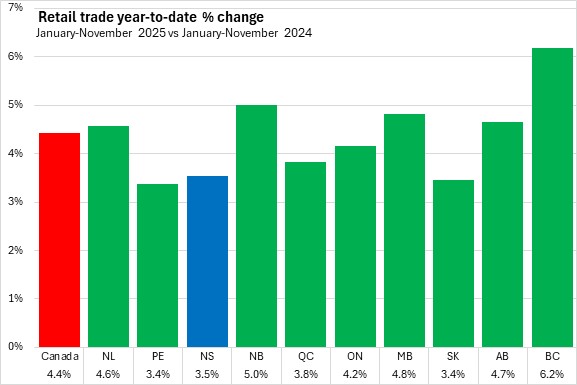 Nova Scotia retail trade increased 3.5% year-to-date compared to the same period last year. Nationally, retail trade was up 4.4% year-to-date. All provinces reported year-to-date increases in retail trade, led by British Columbia. Prince Edward Island reported the slowest growth.