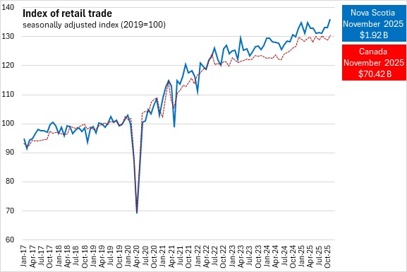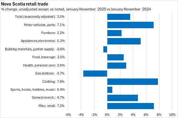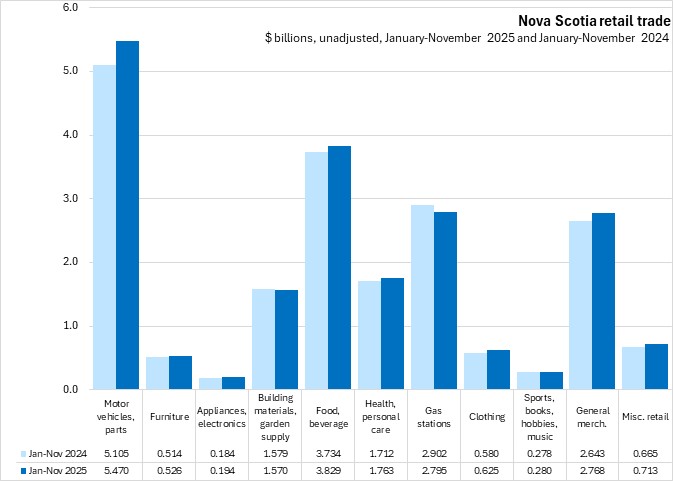 In dollar terms, motor vehicles/parts ($5.470 billion), food/beverage ($3.829 billion) and gas stations ($2.795 billion) contributed the most to Nova Scotia's retail sales in January-November 2025.