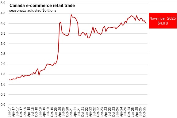 In November 2025, Canada's ecommerce sales decreased 2.8% from the previous month, falling to $4.02 billion, or 5.7% of total retail sales.