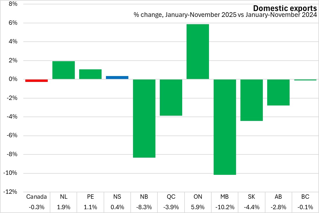 In the first eleven months of 2025 domestic exports rose 0.4% in Nova Scotia compared to the same period in 2024. Canada's exports declined 0.3% for January-November 2025, with six provinces reporting declines led by Manitoba. Ontario reported the largest year-to-date exports growth.