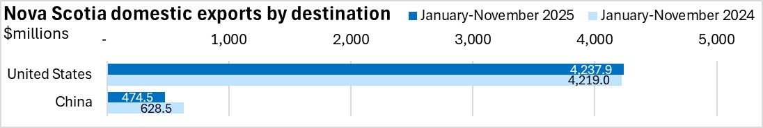 China is Nova Scotia's second largest export destination and exports declined 24.5% to $474.5 million in January-November 2025.