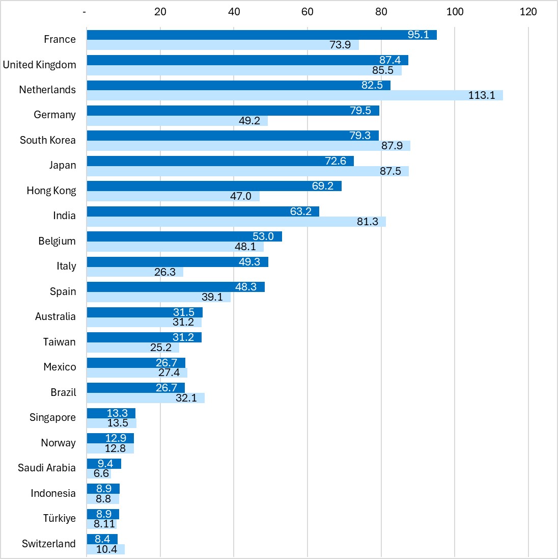 Among the other significant export destinations, year-to-date exports were up most sharply (>20%) to France, Hong Kong, Germany, Spain, Italy, Taiwan and Saudi Arabia. The largest declines (<-20%) in year-to-date exports were to China, India, Netherlands.
