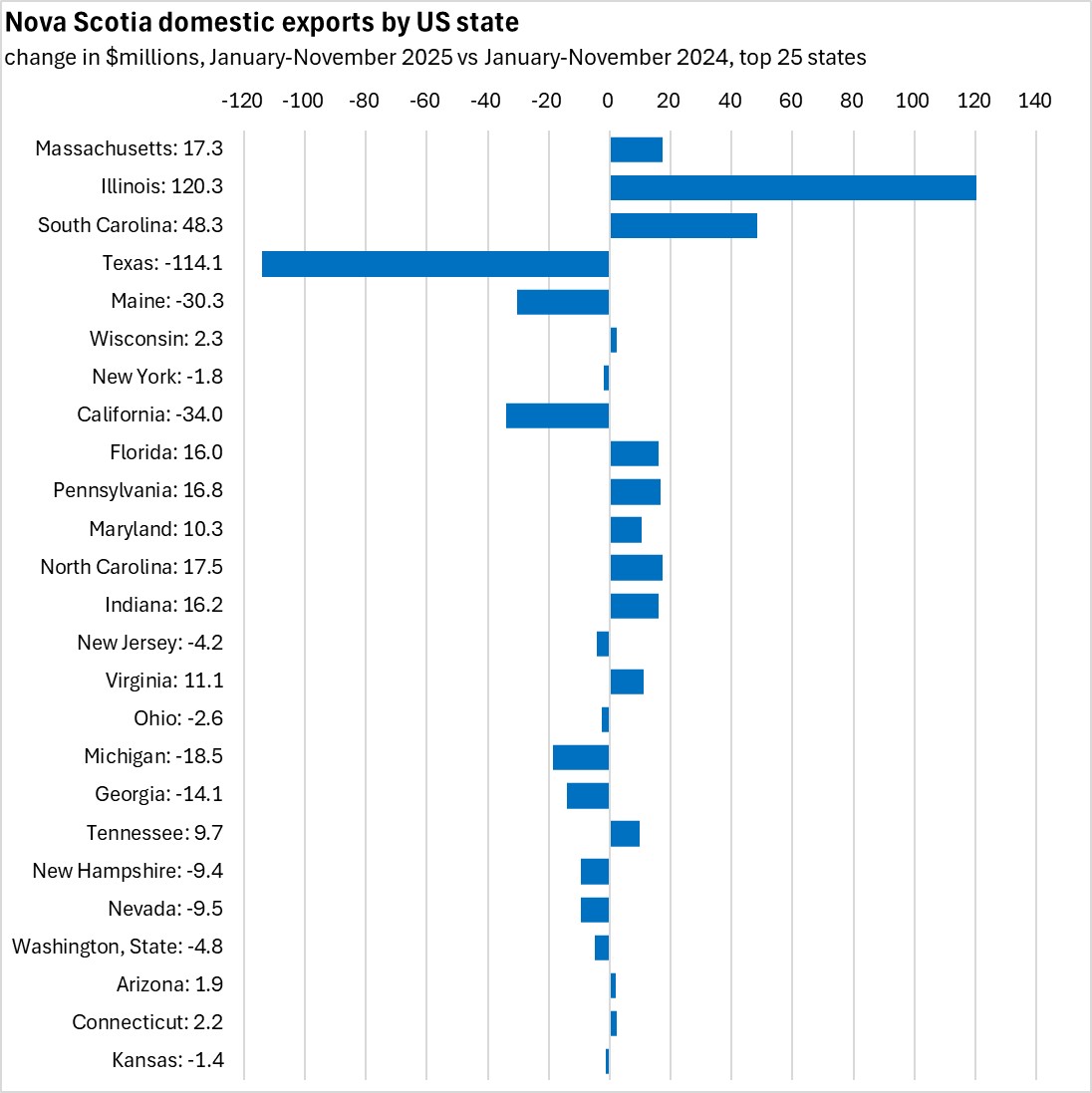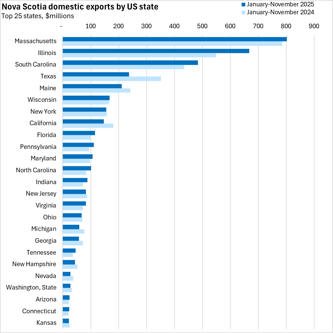 Nova Scotia's exports to the US accounted for 69.7% of exports in January-November 2025. Massachusetts, Illinois and South Carolina each had a larger export value than Nova Scotia's shipments to China in the first eleven months of 2025. Exports were up for six of Nova Scotia's top ten US state destinations; exports were down to Texas, Maine, New York and California. The largest dollar value increases were for Illinois and South Carolina.