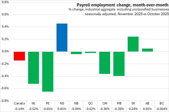 Nova Scotia had 467,653 payroll employees in November 2025, up 0.45% (+2,115) compared to October 2025, the fastest gain among provinces. Canada had 18.25 million employees, down 0.14% from October 2025 with declines in seven provinces. The fastest decline was reported in Prince Edward Island.