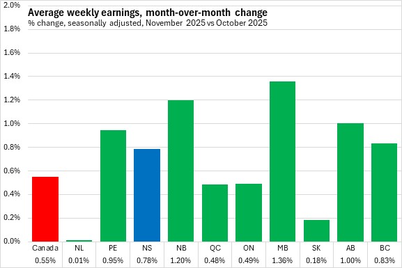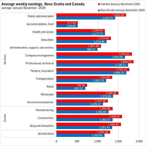 Nova Scotia's average weekly earnings in November 2025 were second lowest among provinces, ahead of Prince Edward Island. Alberta and Ontario reported the highest average weekly earnings.
