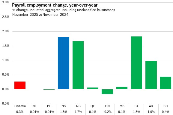 Compared with the same month in 2024, Nova Scotia's payroll employment increased by 1.8% (+8,278) in November 2025, the fastest gain among provinces (tied with Saskatchewan). Nationally, payroll employment increased 0.3%, with gains in all provinces except Ontario and Prince Edward Island.