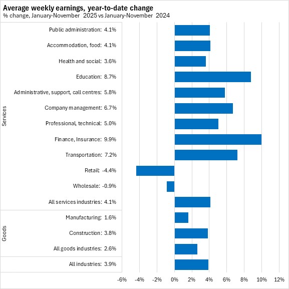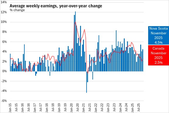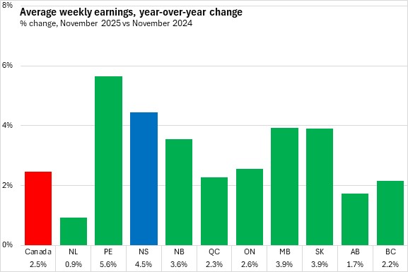Average weekly wages grew by 4.5% in Nova Scotia from November 2024 to November 2025, the second fastest gain among provinces. This was stronger than the national pace of 2.5%.