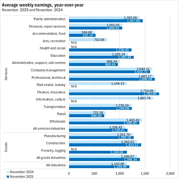 Nova Scotians' average weekly earnings were $1,194.94 in November 2025, an increase of $9.30 (+0.78%) from October 2025.