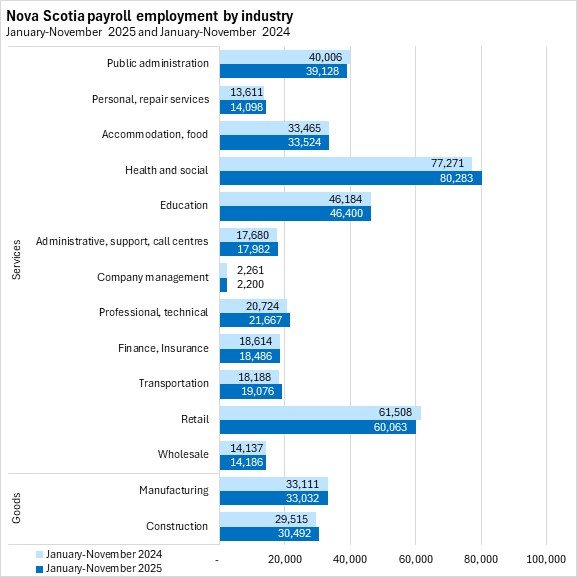 Transportation, professional/technical, health care/social assistance, and personal/repair services reported the fastest growth in payroll employment in the first eleven months of 2025 in Nova Scotia. The fastest declines were reported in company management, retail trade, and public administration.