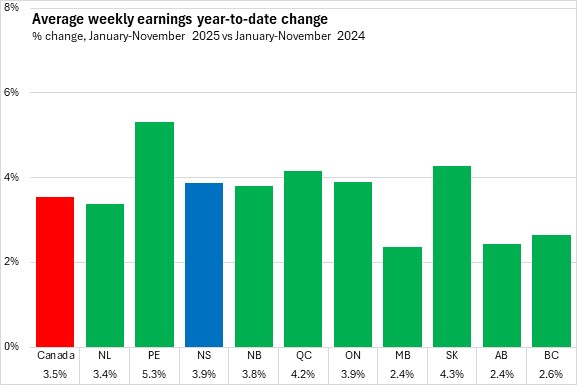 In January-November 2025, average weekly earnings grew 3.9% in Nova Scotia compared to the same period last year. National average weekly earnings grew 3.5% with all provinces reporting growth over this period. Prince Edward Island reported the fastest growth while Manitoba and Alberta reported the slowest.