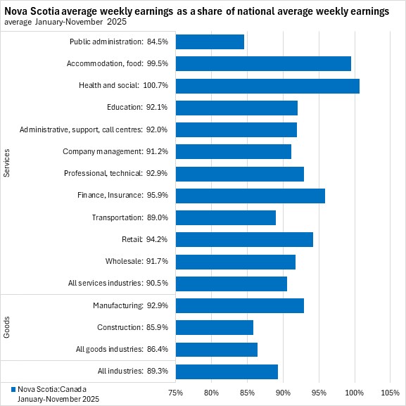 In November 2025, Nova Scotia's average weekly wages were 90.7% of the national average. Nova Scotia average weekly wages were below the comparable national average for every industry except health/social assistance, finance/insurance, and accommodation/food services. The largest gap was reported in forestry/logging (76.7% of the national average).