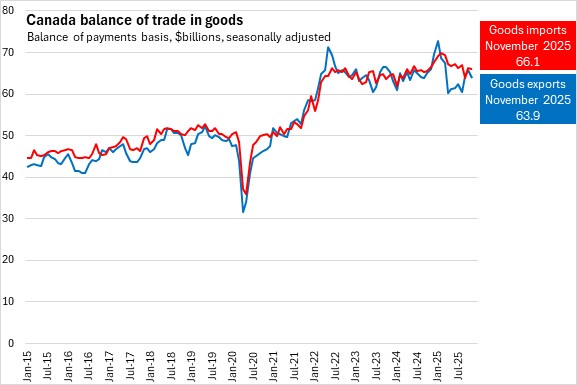In November 2025, Canada's international exports of goods declined 2.8% to $63.9 billion. Canada’s goods imports edged down 0.1% to $66.1 billion. Canada's goods trade balance deteriorated by $1.8 billion to a deficit of $2.2 billion in November.