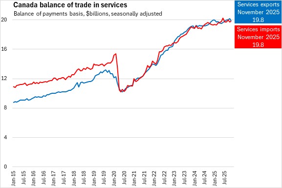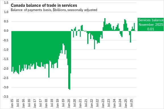 Canada's international exports of services declined 1.5% from the previous month to $19.8 billion in November 2025. Canada's imports of services were up 0.5% to $19.8 billion. As imports rose while exports declined, Canada's services trade surplus declined by $411 million to $11 million in November.