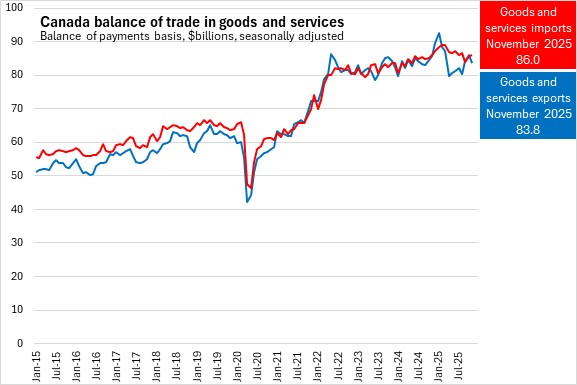 Canada’s international exports of goods and services fell 2.5% to $83.8 billion in November 2025. Canada's international imports of goods and services 0.1% to $86.0 billion. Canada's overall international trade position deteriorated from a $27.1 million surplus in October to a $2.2 billion deficit in November 2025.