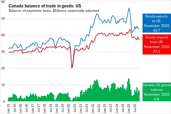 Significant changes in US tariff policy led to a pre-tariff increase in Canadian goods exports to the US (building inventories of goods before tariffs take effect), followed by a sharp post-tariff decline. Retaliatory measures and changes in consumer preferences have also influenced Canadian imports of goods from the US during this period. Exports of goods to the United States from Canada fell 1.8% to $43.7 billion in November 2025 while imports of goods from the US fell 5.4% to $37.1 billion. Canada's trade surplus in goods with the US grew by $1.3 billion to $6.6 billion in November 2025.