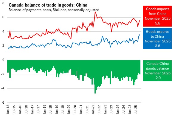 Canada's exports of goods to China rose 8.8% to $3.6 billion in November 2025. Canada's imports of goods from China rose 9.1% to $5.6 billion. Canada's deficit in goods trade with China widened by $175 million to $2.0 billion.