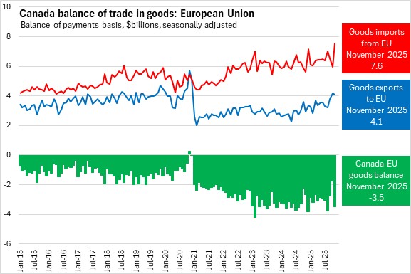 In November 2025, Canada's exports of goods to the European Union declined 3.2% to $4.1 billion. Canada's imports of goods from the EU grew 26.7% to $7.6 billion. Canada's deficit in goods trade with the EU widened by $1.7 billion to $3.5 billion.