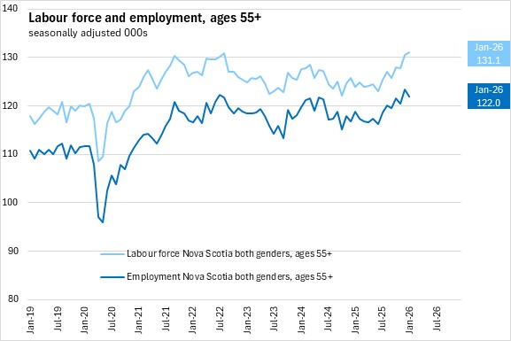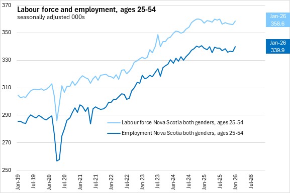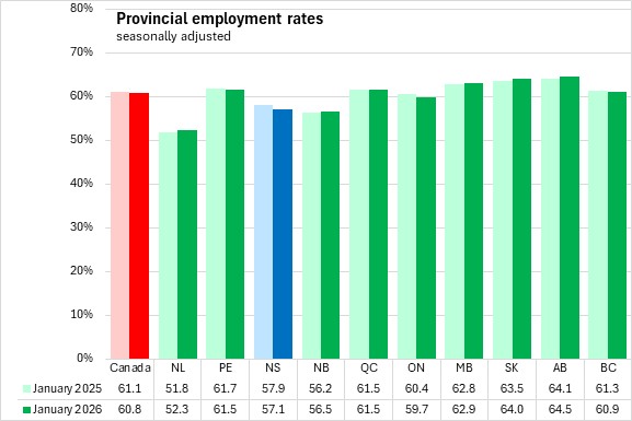 Compared with January 2025, Nova Scotia's population over the age of 15 increased by 8,800 (+1.0%), while the labour force rose by 3,200 (+0.6%), and employment decreased by 1,600 (-0.3%). Compared to January 2025, the unemployment rate was up by 0.8 percentage points, while the participation rate declined by 0.2 percentage points and the employment rate declined by 0.8 percentage points.