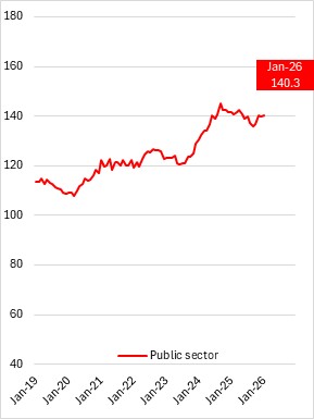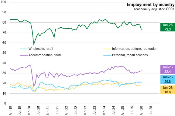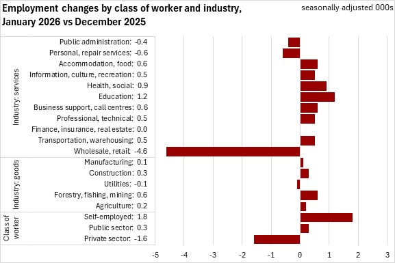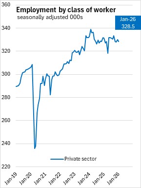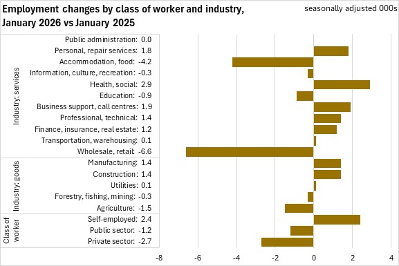 Compared to January 2025, employment declined for private sector workers (-2,700, -0.8%), and public sector (-1,200, -0.8%), partially offset by higher self-employment (+2,400, +4.5%).