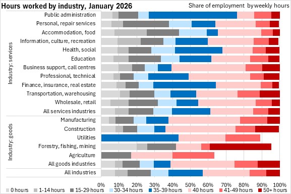 Compared to the provincial average, a larger share of workers in goods producing industries, transportation/warehousing, and business support/call centres worked more than 40 hours per week in January 2026.
