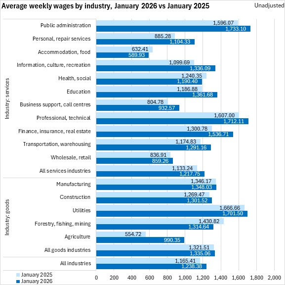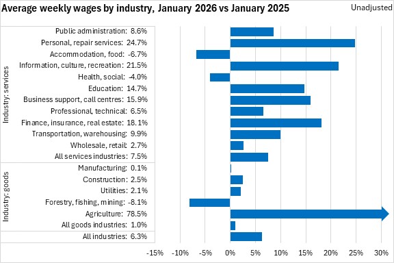 Average weekly earnings increased by 6.3% from January 2025 to January 2026. The fastest gains in average weekly earnings were in agriculture (where weekly earnings were notably lower than average in January 2025), followed by personal/repair services, information/culture/recreation, and finance/insurance/real estate. Declines in average weekly wages were reported in forestry/fishing/mining, accommodation/food services and health care/social assistance.