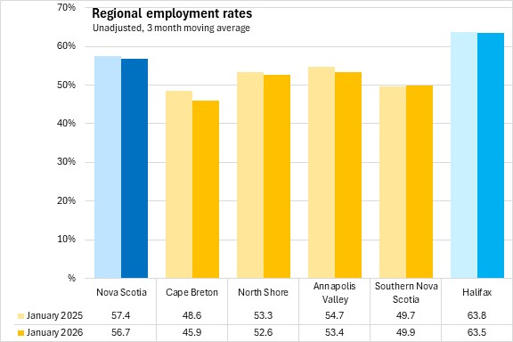 Halifax & East Hants reported an employment rate of 64.0% in the seasonally adjusted January 2026 three month moving average, while the employment rate was 50.2% outside the city.