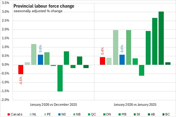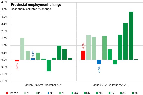 Compared with January 2025, the national employment gain was 0.6% with eight provinces reporting growth. The fastest growth was in Alberta. Ontario and Nova Scotia were the only provinces to report year-over-year declines (both -0.3%).