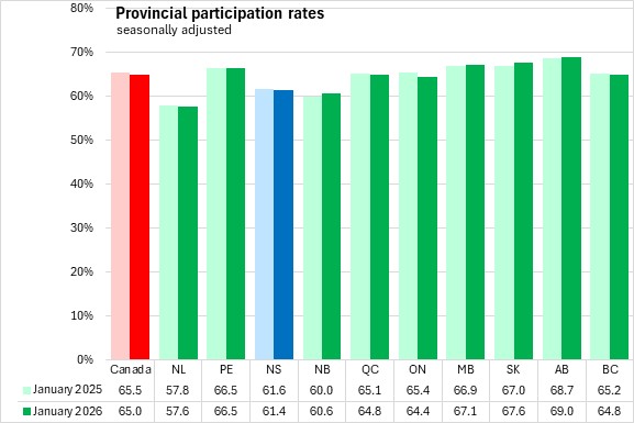 The national participation rate was 65.0% in January 2026. The highest participation rate was in Alberta while the lowest was in Newfoundland and Labrador.