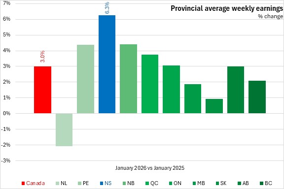 In unadjusted results, Nova Scotia's average weekly earnings grew by 6.3% year-over-year, the fastest gain among provinces. National average weekly earnings were up 3.0% with gains in all provinces except Newfoundland and Labrador.