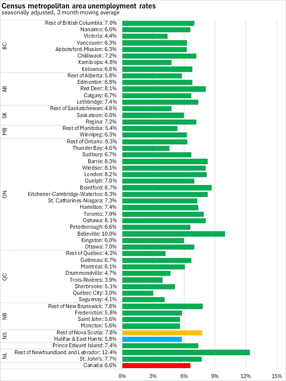 The Halifax & East Hants unemployment rate was 5.8% in the seasonally adjusted January 2026 three month moving average. Outside of Halifax & East Hants the unemployment rate was 7.8%. In central and western provinces, unemployment rates in Census Metropolitan Areas are similar to or higher than unemployment rates outside of CMAs. In the Atlantic Provinces unemployment rates are typically higher outside of CMAs.