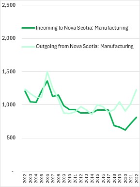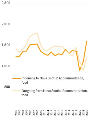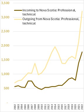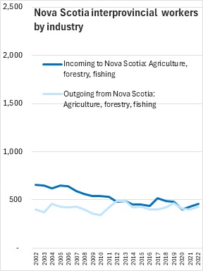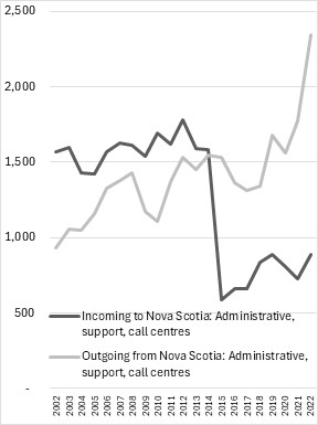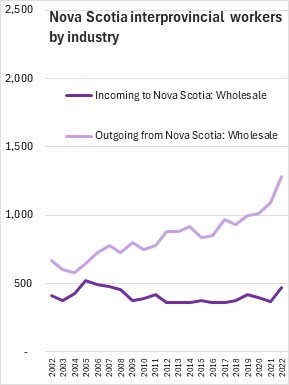 In recent years, there have been rising numbers of outbound interprovincial workers from Nova Scotia in: wholesale trade, transportation, professional/technical services and administrative support/call centres. There was also a significant rise in inbound workers arriving from other jurisdictions to work in Nova Scotia's professional/technical and accommodation/food services industries in 2022.