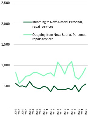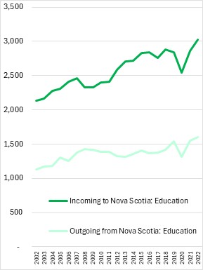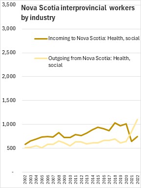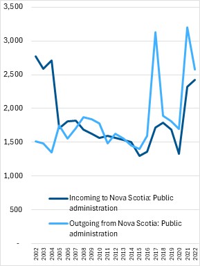 There was a sharp rebound in interjurisdictional work in public administration in 2021 (both inbound and outbound) followed by a decline in outbound workers in 2022. Education workers both inbound and outbound increased in 2022. The number of inbound health workers coming to Nova Scotia increased in 2022 after declining in 2021 while the number of Nova Scotian workers across Canada in health care and social assistance (including daycare) continued to rise.